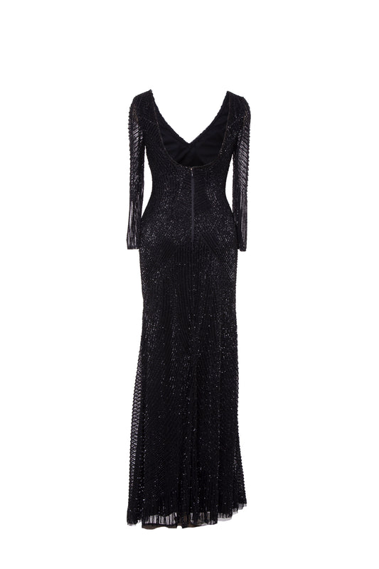 Midnight Noir Beaded V-Neck Maxi Gown