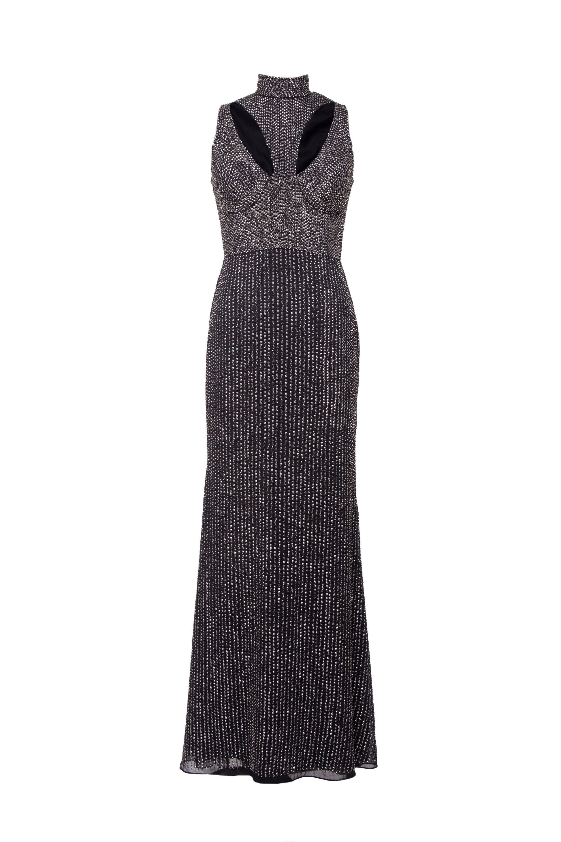 The hand-embroidered designer gown in gray pure nylon mesh, adorned with sequins and beads, is a sophisticated and glamorous option for formal occasions. Featuring a mock neck, a fitted bodice, and sleeveless design, it accentuates the feminine silhouette. The floor-length fall and back zipper add an elegant touch. This gown is ideal for red carpet events, black-tie galas, upscale cocktail parties, or even high-end weddings. With its intricate embroidery and exquisite detailing, it stands out as a fashionable choice, reflecting grace and elegance.