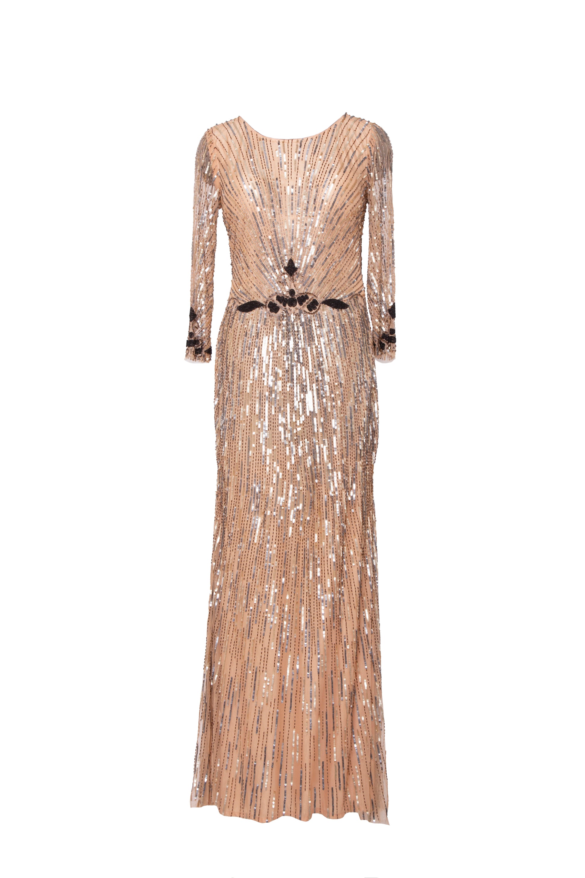 The dress showcases a breathtaking display of hand-embroidered details, including shimmering sequins and intricate cut tube beads.