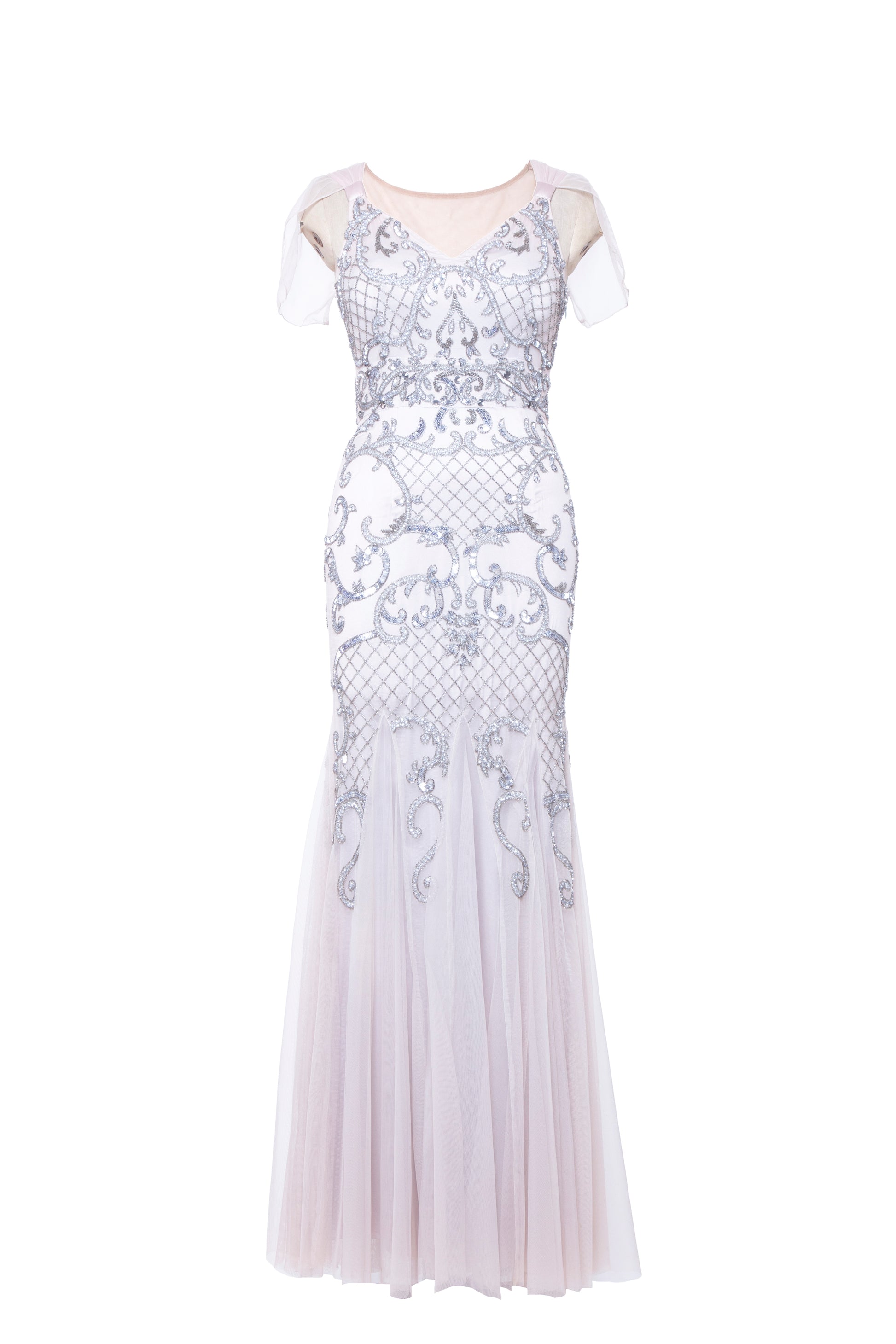 Presenting an enchanting mermaid-style tulle gown in a soft, luminous shade, elegantly embellished with intricate embroidery. The gown features a captivating V-neckline, graceful designer sleeves, and a translucent back that adds an air of mystique. Adorned with sparkling sequins, stones, and elaborate zardozi dabka work, this dress exudes an aura of lavishness. Ideal for prestigious events, glamorous parties, or extravagant social gatherings, the gown's flared back guarantees a dramatic entrance and an indelible impression in any upscale setting.
