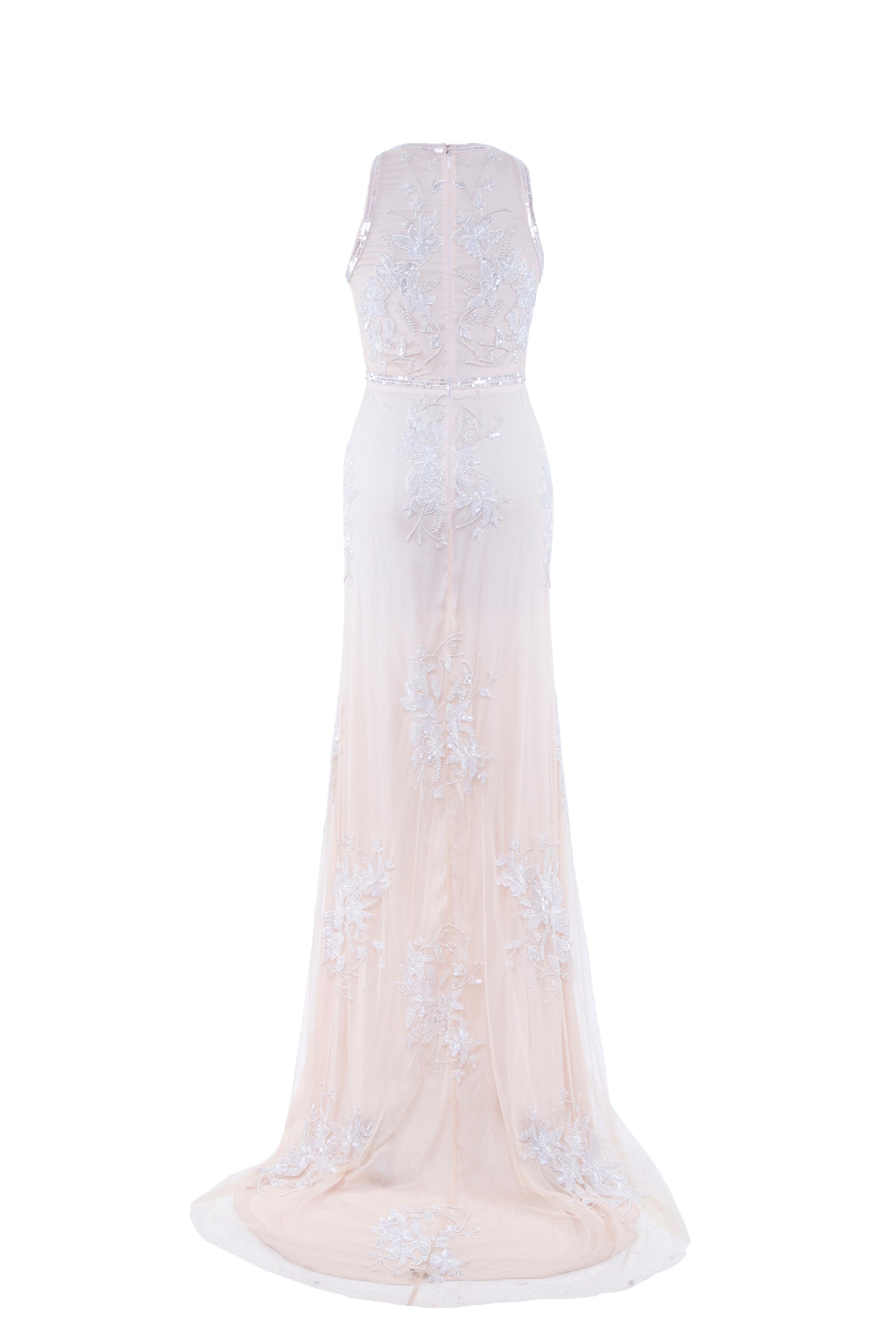 This magnificent Western dress crafted from nylon mesh displays a soft and delicate color palette of pink and peach, evoking a sense of elegance and charm. Its rounded neckline, figure-hugging bodice, and sleeveless design contribute to its timeless appeal. The intricate hand-embroidered motifs, embellished with shimmering beads and sequins, demonstrate exceptional artistry. The dress's trailing back and convenient zip closure ensure both grace and comfort. This exquisite ensemble is tailor-made for extravagant gatherings, glamorous galas, or lavish weddings, where its enchanting presence will captivate admirers.