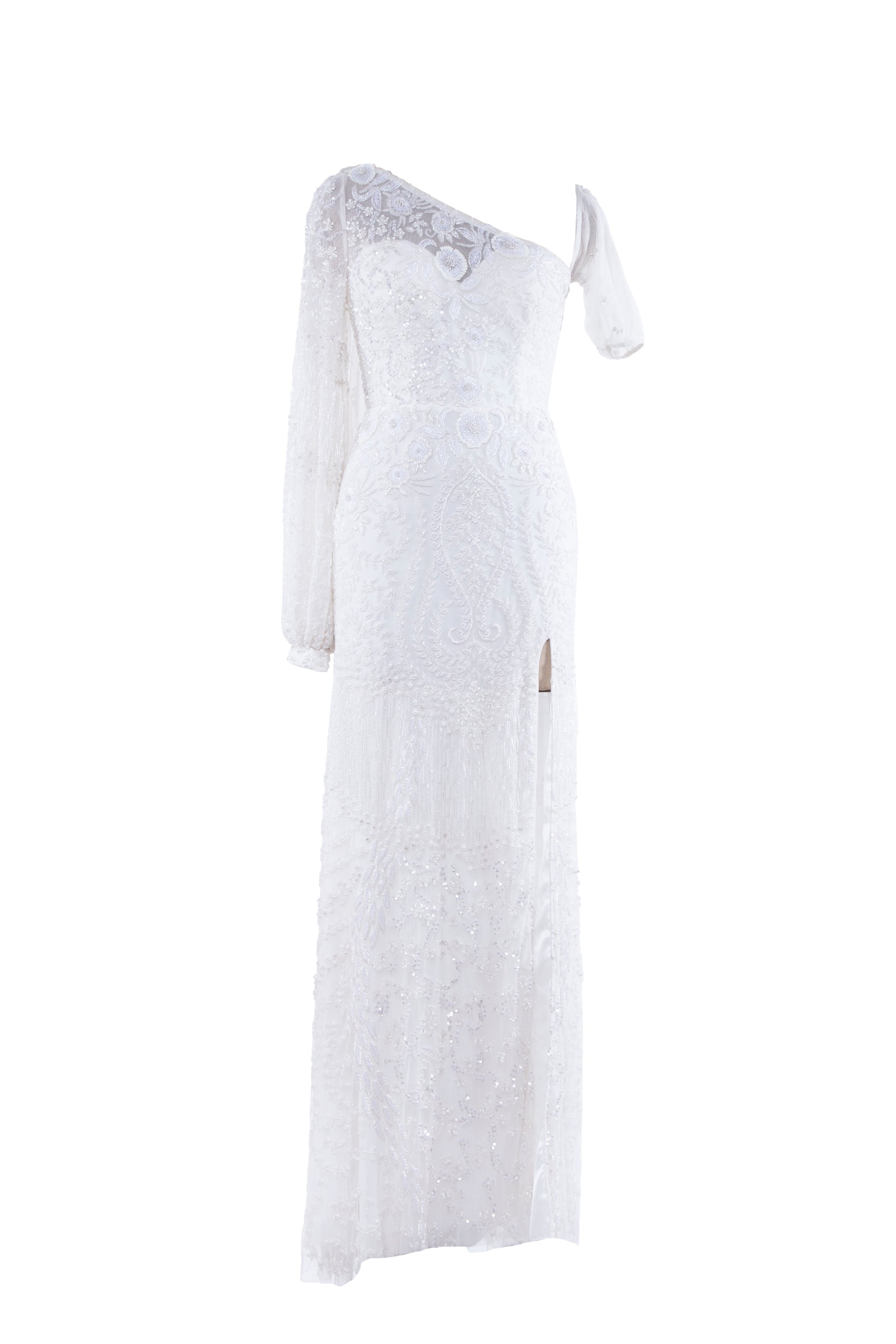 Witness the spellbinding allure of a white dress, exuding an irresistible charm that captivates onlookers. Its asymmetrical neckline evokes curiosity and ignites a sense of fascination. Adorned with intricate artistry, the Zardozi embroidery, cut tube beads, and sequin beads intertwine, forming a captivating tapestry of floral motifs delicately spread across the tulle fabric. Featuring a different style of sleeves, a chic slit, and a concealed zip at the back, this dress emanates an aura of grace and sophistication, rendering it a fitting choice for extravagant festivities and grand occasions where elegance reigns supreme.