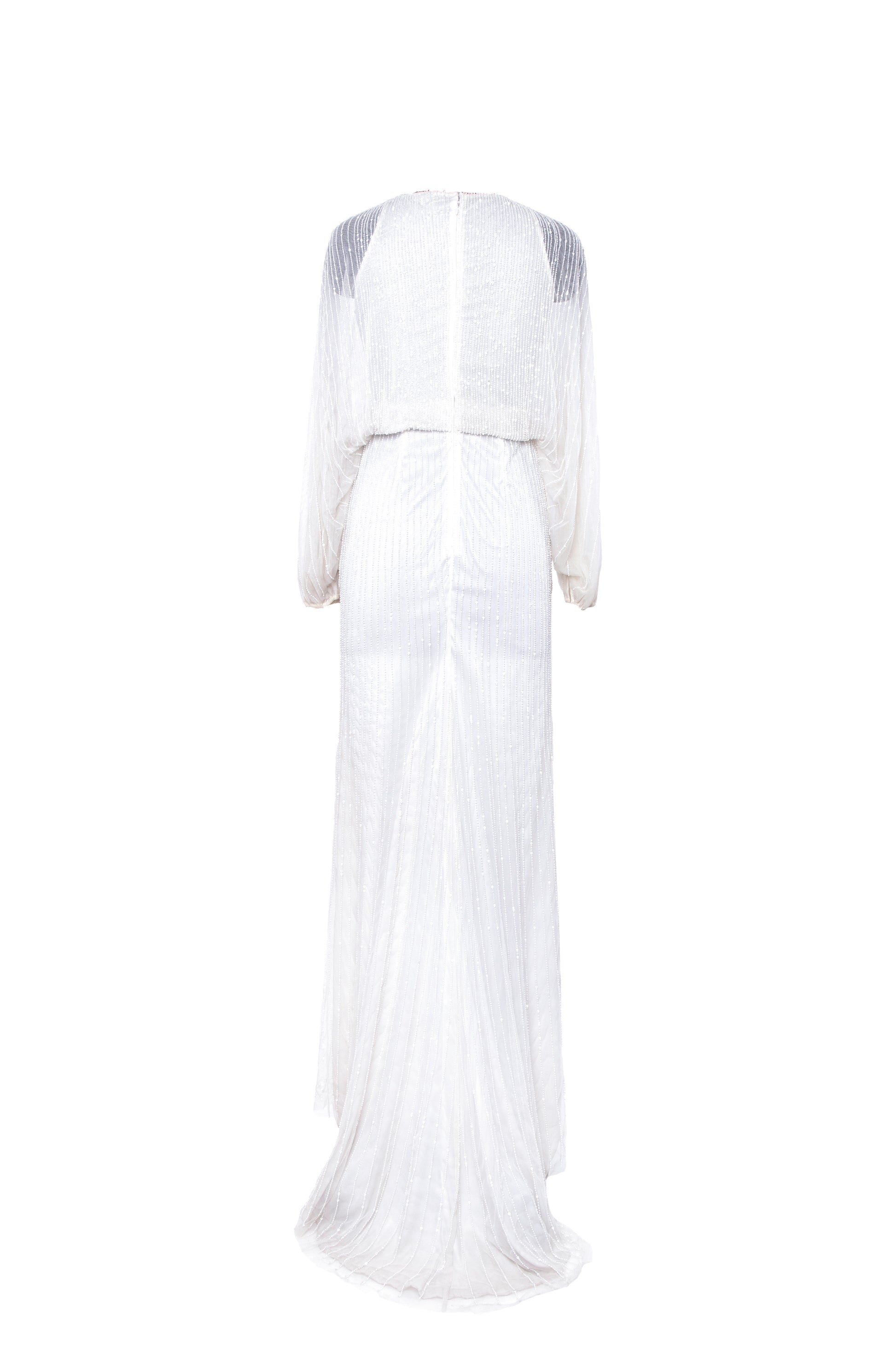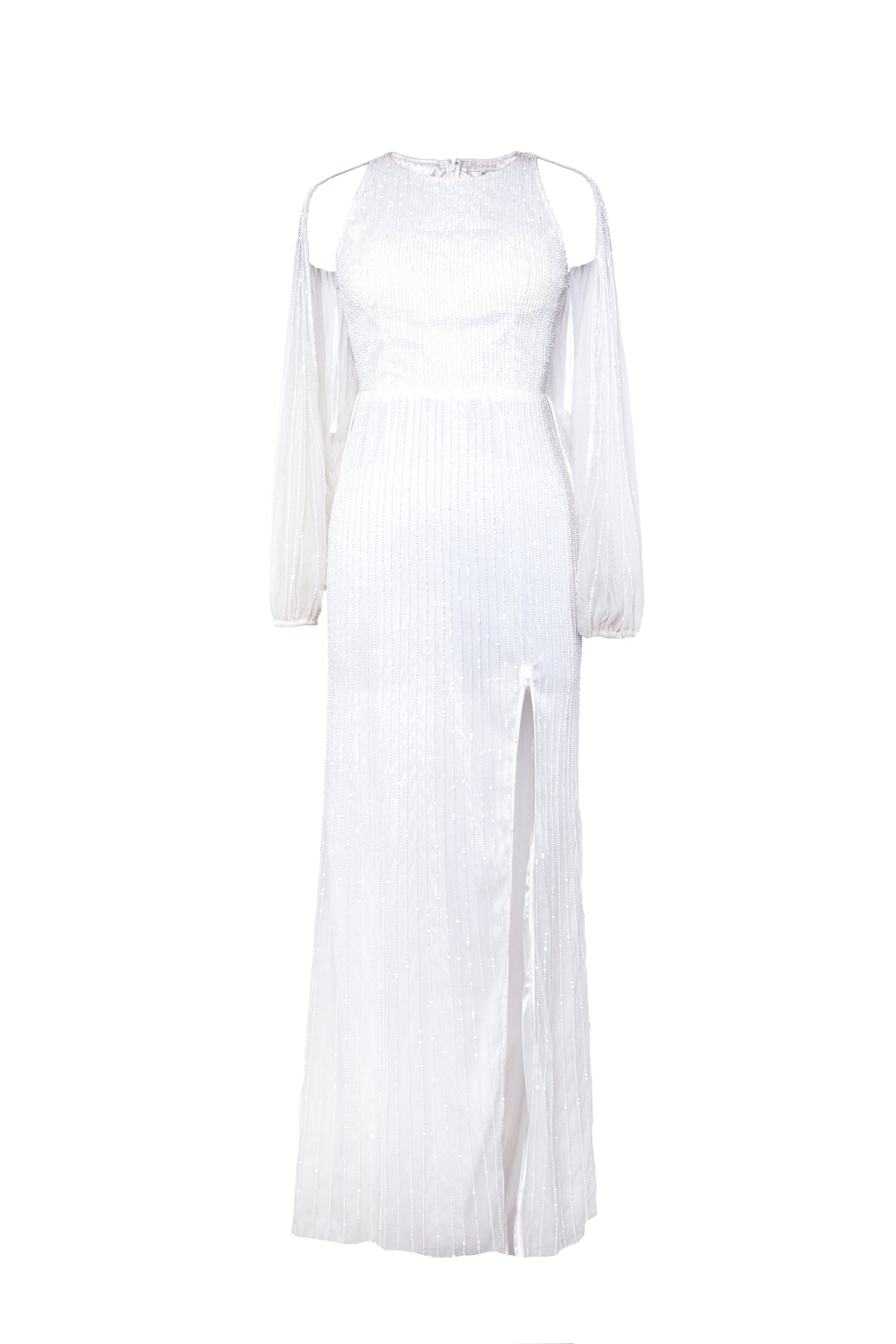 Moulded with utmost precision, this exquisite silver white gown is a vision of elegance. Its flawless fit embraces your curves, while the round neckline and slit full sleeves add a touch of sophistication. The intricate sequin and bead work shimmer under the lights, creating a mesmerizing effect. A subtle side slit adds a hint of allure, while the flared trail back exudes grace and poise. With a convenient zip closure, this gown is perfect for high-profile events such as red-carpet galas, black-tie affairs, weddings or upscale cocktail parties, where you'll undoubtedly be the epitome of style and grace.
